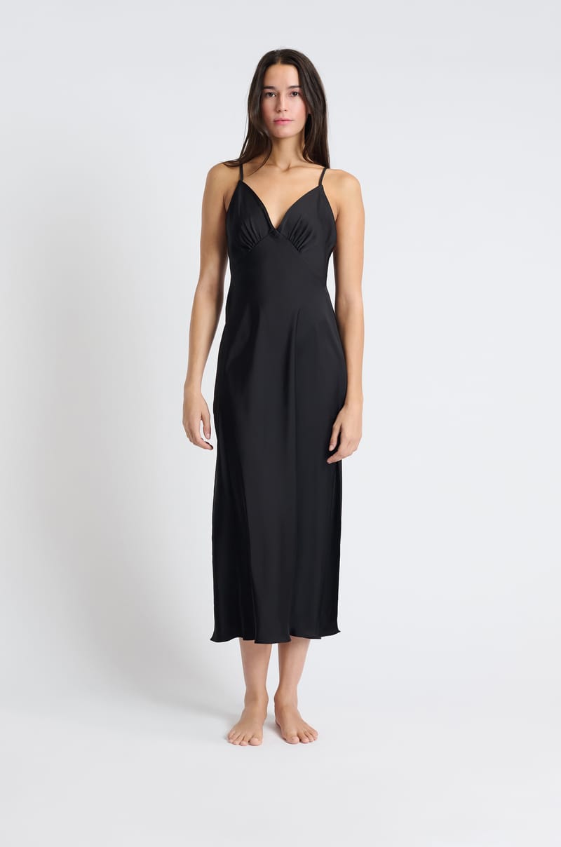Dieses lange Négligé mit fliessendem Schnitt bietet ein satiniertes Finish. Mit dünnen Trägern und einem seitlichen Schlitz versehen, verleiht es eine Note der Leichtigkeit.